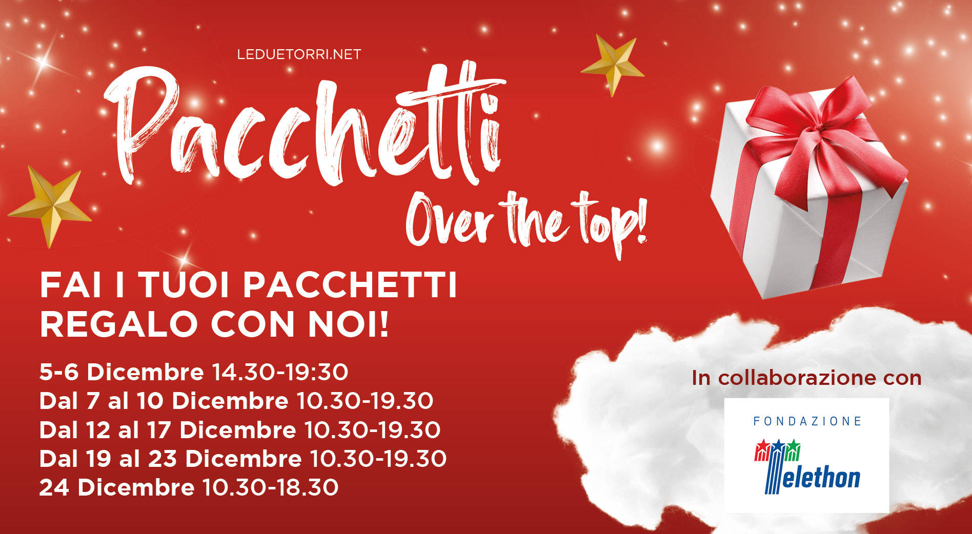 Questo Natale, libera il tuo tempo per ciò che davvero conta! Dal 5 al 24 dicembre alle Due Torri impacchettiamo i tuoi regali con cura e stile, regalandoti la tranquillità di goderti le festività senza stress. Porta i tuoi regali da noi e lascia che il nostro team esperto li avvolga con dedizione. Regala, rilassati e goditi ogni momento. Siamo qui per rendere il tuo Natale ancora più speciale. Vieni a scoprire il lusso di un regalo perfettamente impacchettato!